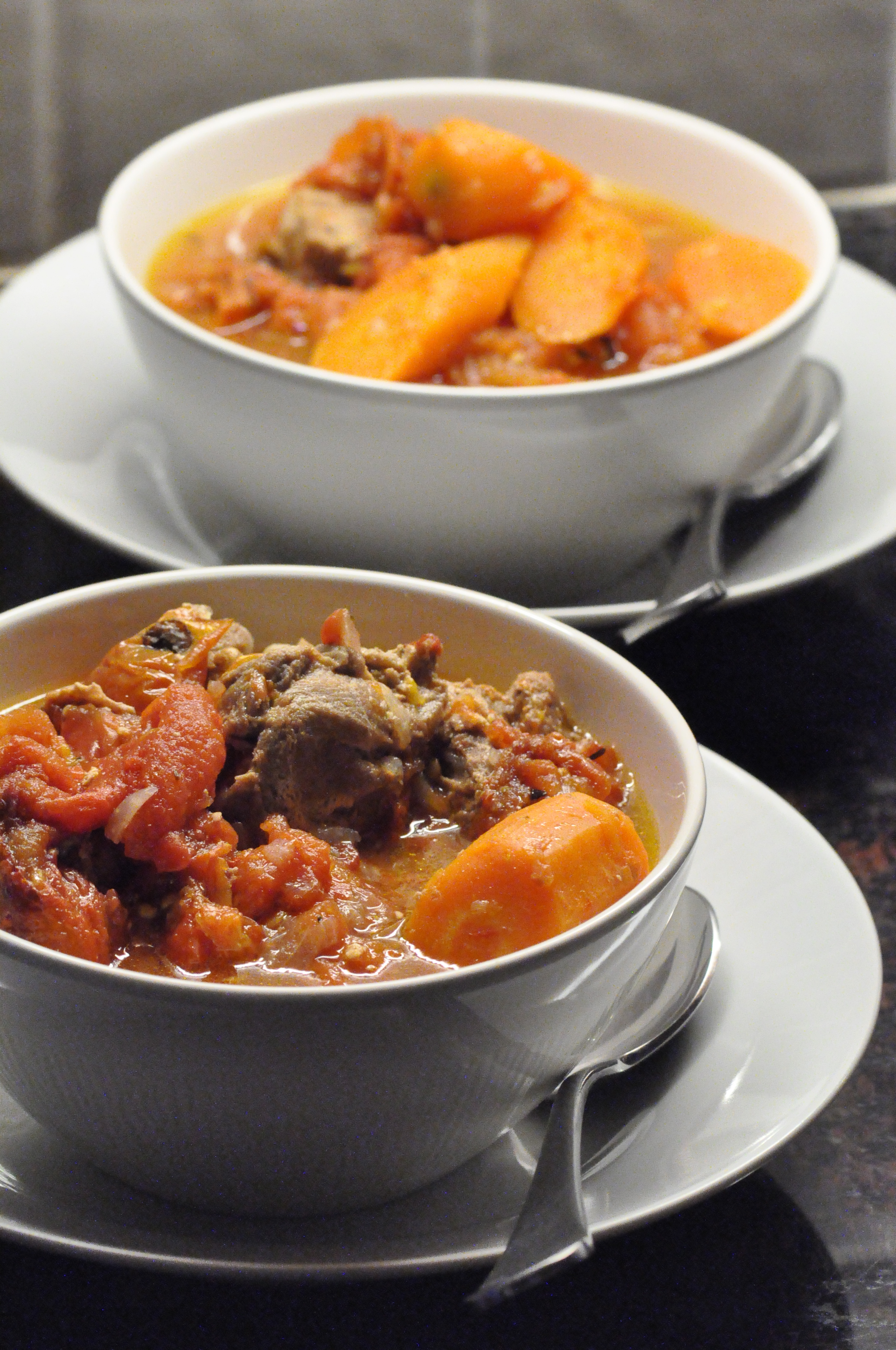 Using the pressure cooker, heat a lug of olive oil on medium to high heat and sautee the red onions till soft and lightly browned. Then, add the garlic for a minute before placing the lamb and its marinade in the cooker but do not stir. Next, arrange half the Whole Roasted Tomatoes with skin on along with the carrots on top of the lamb and cover the cooker with its lid. Cook for 18 minutes (Start timing after the first whistle). Once the time is up, let the stew rest in the cooker till all the steam has escaped on its own for approximately another 15 minutes. REMEMBER: Only remove the lid once all of the steam has escaped!