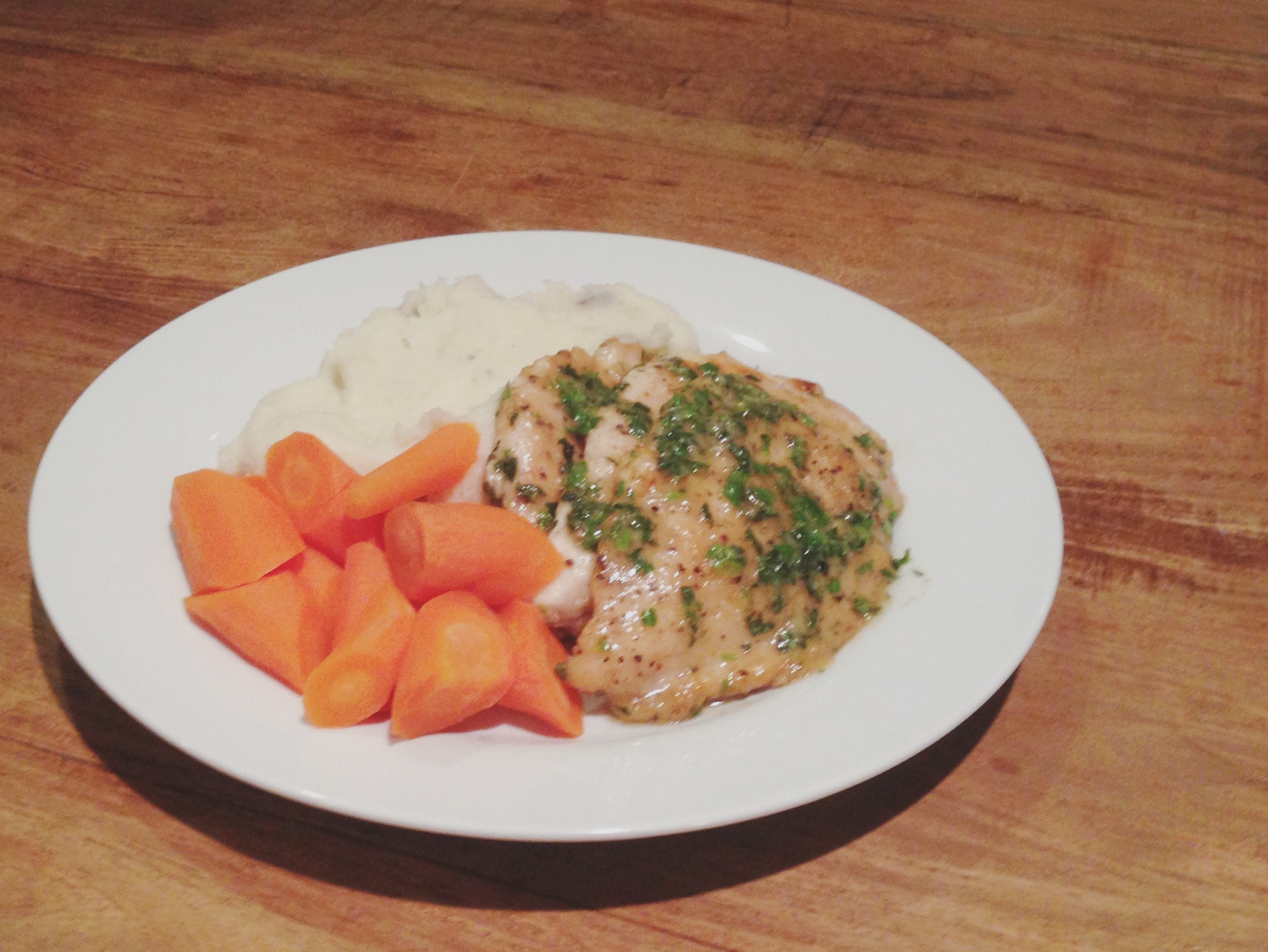 So, yesterday, I mentioned that we are cutting down on red meat and I need to find ways to make chicken exciting. Today, I am going to present you 3 recipes; protein and the works on a plate! The result, was truly divine! Chicken Cutlets with Herb Butter, Creamy Mashed Potatoes and Steamed Carrots.