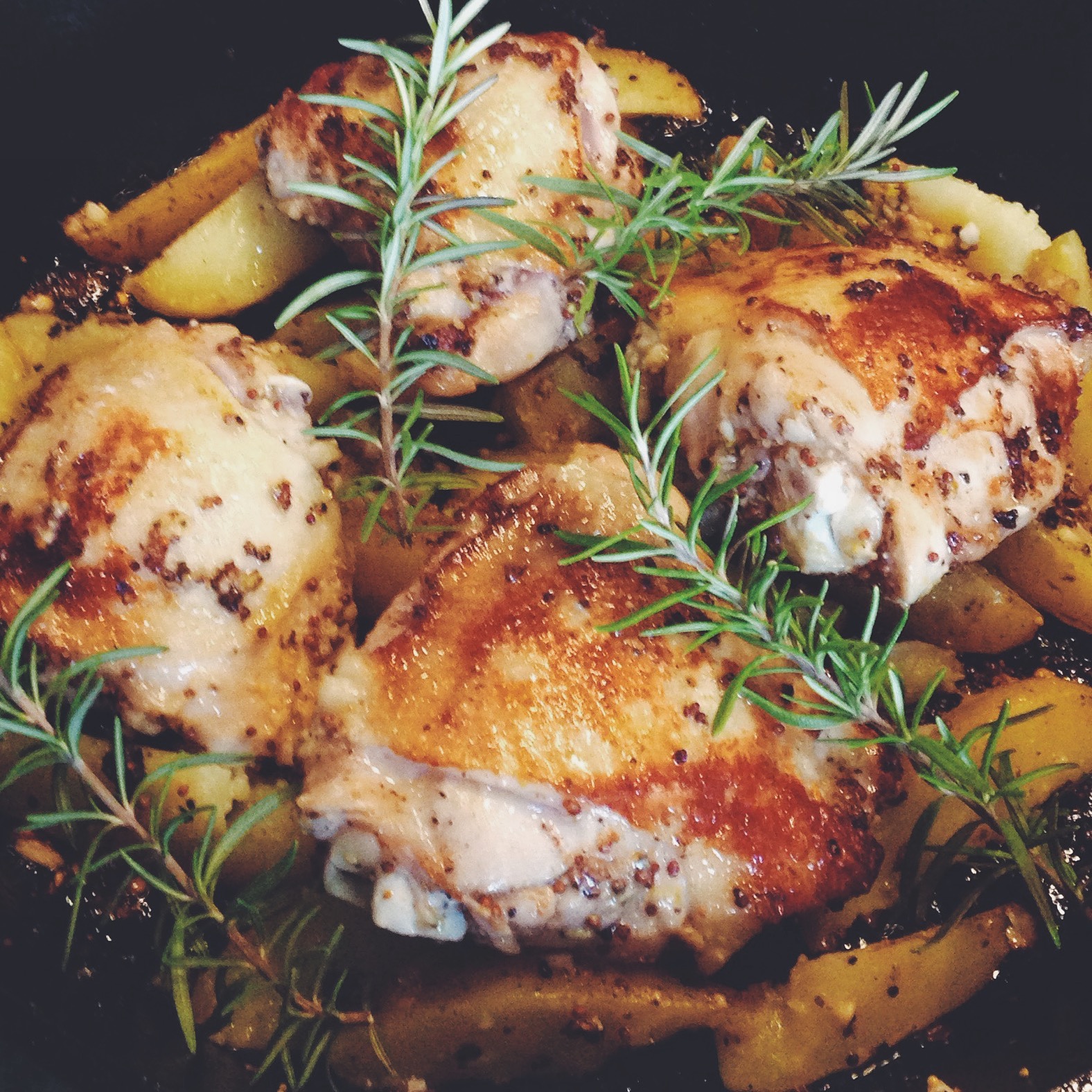 In the same skillet, add the par boiled potatoes and any remnants of the marinade. Using a large flat spatula, carefully scoop all the goodness from the pan and mix them well with the potato wedges. At this point, be sure to spread the potatoes into a single layer (for it to get perfectly brown and crispy at the end) before laying the chicken thighs onto the potatoes. Then, place the sprigs of rosemary on top and into the oven for 30 minutes!