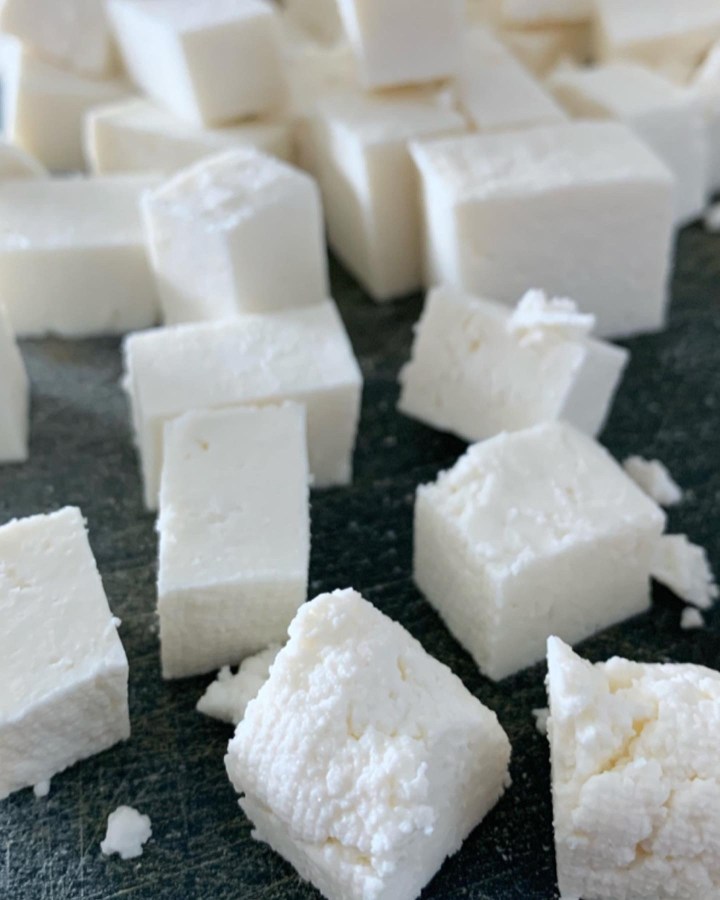 To continue with paneer making, you need to drain as much of the liquid out of the curdled milk before shaping it into a disc and placing it between two plates and weighing it down with something heavy like a canned or jar of tomatoes. Rest the latter atop the plate of the disc-shaped-soon-to-be-paneer in the refrigerator for a couple of hours. Once done, remove the plates from the refrigerator, unwrap the paneer from the cheesecloth, cube them and they’re ready to be eaten or made into your favorite dish.
